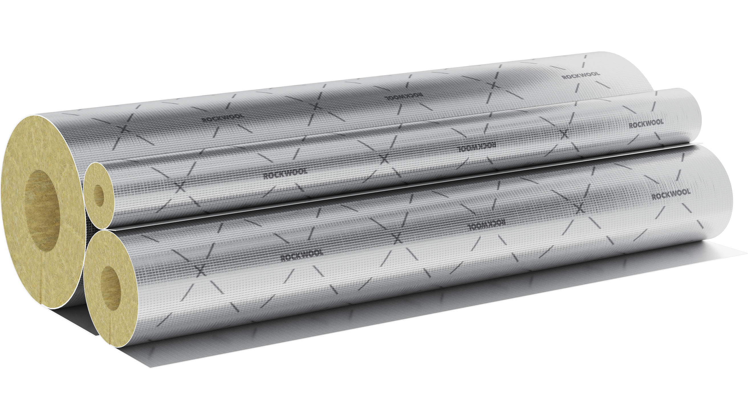 Coppella in lana di roccia, con disposizione concentrica delle fibre, rivestita su un lato da un foglio di alluminio rinforzato da una rete in fibra minerale con funzione estetica, per isolare termicamente e acusticamente le tubazioni in applicazioni in campo caldo.