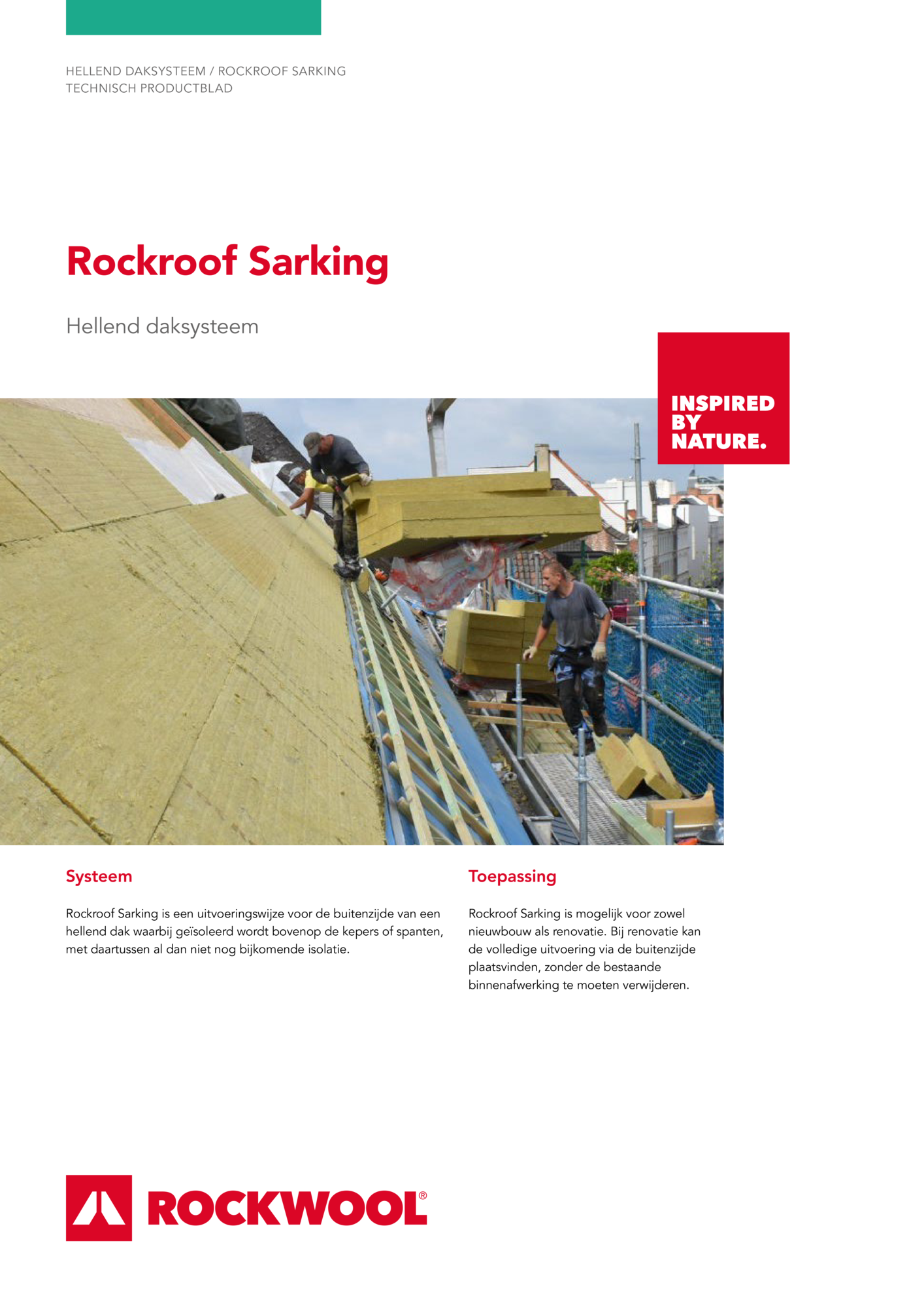 Panneau isolant à double densité, faisant par du système Rockroof Sarking, avec une couche supérieure bien résistante à la pression. Pose à l'extérieur de la toiture : côté le plus long horizontalement sur le plancher de la toiture, à partir de la poutre de support en bas de la pente et ensuite avec des joints décalés jusqu'au faîtage. Fixation à la menuiserie en prenant le panneau en sandwich entre le plancher du toit et le film de sous-toiture, à l'aide de vis à travers les lattes.