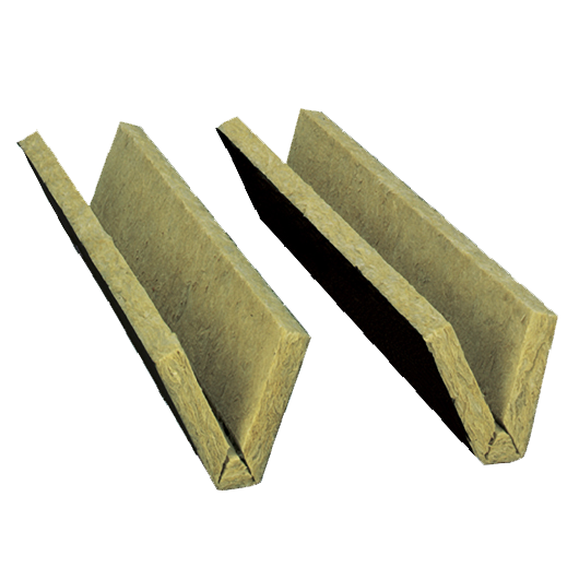 Massiver, trapezförmig zugeschnittener Profilfüller aus nichtbrennbarer Steinwolle zum Verfüllen von Trapezprofilhohlräumen, 150 kg/m³ Rohdichte.