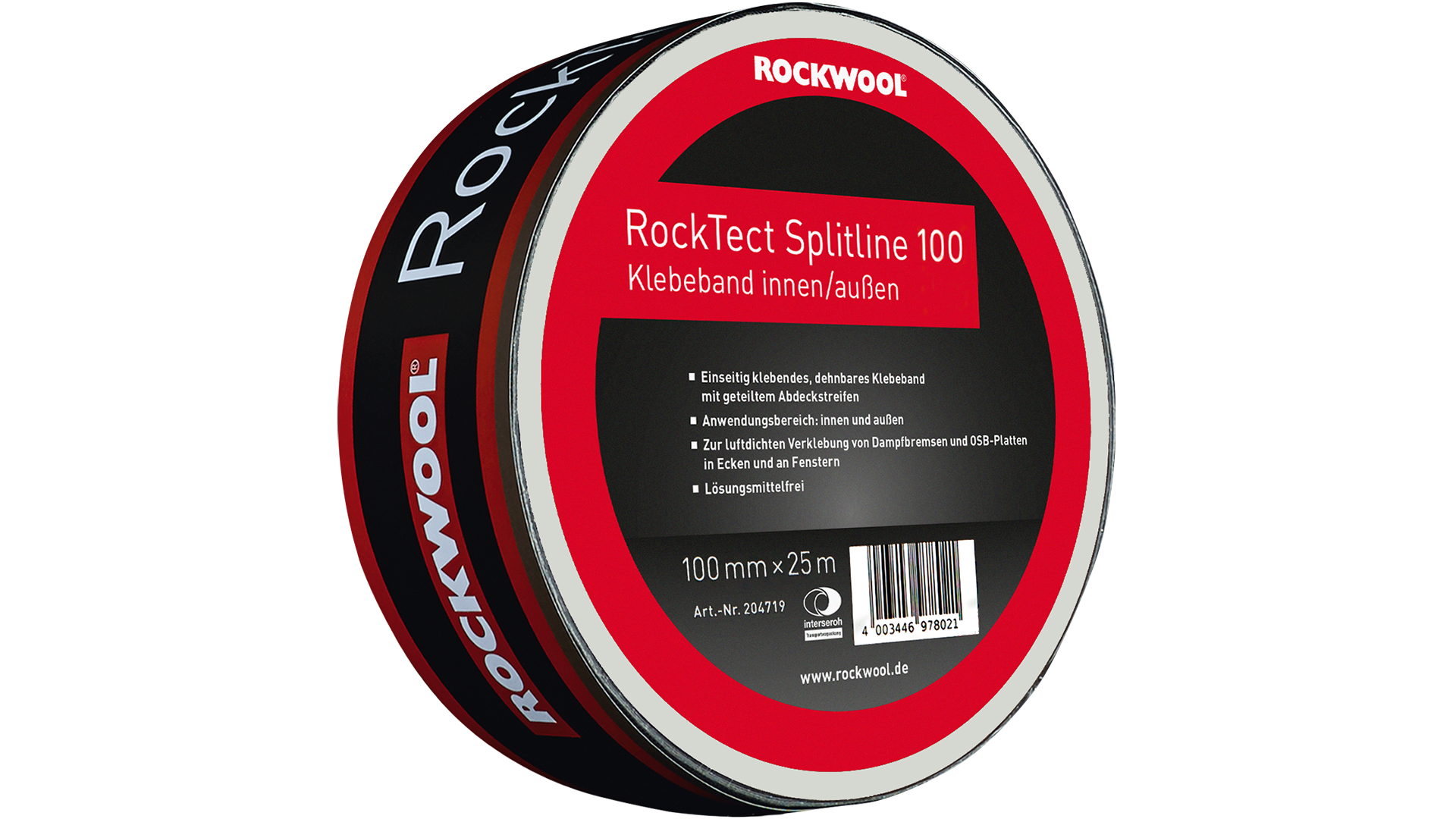 RockTect Splitline ist ein spezielles, dehnbares Folienklebeband mit geteiltem Abdeckstreifen zur luftdichten Verklebung von Überlappungen von Dampfbremsen, Unterdeck- und Unterspannbahnen sowie Stößen bei OSB-Platten.