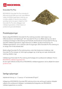 ROCKWOOL Granulate Pro Plus anvendes til efterisolering på loftet og er den mest effektive måde at forbedre bygningens isolering, og mindske udgiften til opvarmning markant samtidig med at du sparer miljøet for CO2. Granulate Pro Plus skal udlægges med indblæsningsmaskine, hvilket kræver en professionel granulatindblæser..