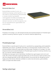 Rockorbit Batts anvendes til varme- og lydisolering af garager, parkeringshuse o.l., hvor der ønskes en synlig loftisolering. Rockorbit Batts er robuste, halvstive og trykstabile isoleringsplader fremstillet af ubrændbar, fugt- og vandafvisende stenuld. Pladen fås som standard med enten sort eller hvid glasvlies, men kan som specialdimension også bestilles med aluminiumsfolie.