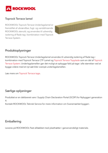 ROCKWOOL Toprock Terrace Underlagslamel anvendes til udvendig isolering af flade tag i kombination med Toprock Terrace System eller Toprock Terrace Topplade, underlagslamellen er plan og gør det muligt at i kombination med Toprock terrace system at lave tykkere indbygning højder, samt i kombination med Toprock Terrace Topplade at lave plane løsninger. Underlagslamellen er har en høj trykstyrke på 175 kPa og gør den ideel til terrasser, den opfylder SBI 280 anbefalet værdi på trykstyrke til terrasser. se funktionelle tage for langtids bærevnen ved punktbelastning og jævn fordelt belastning