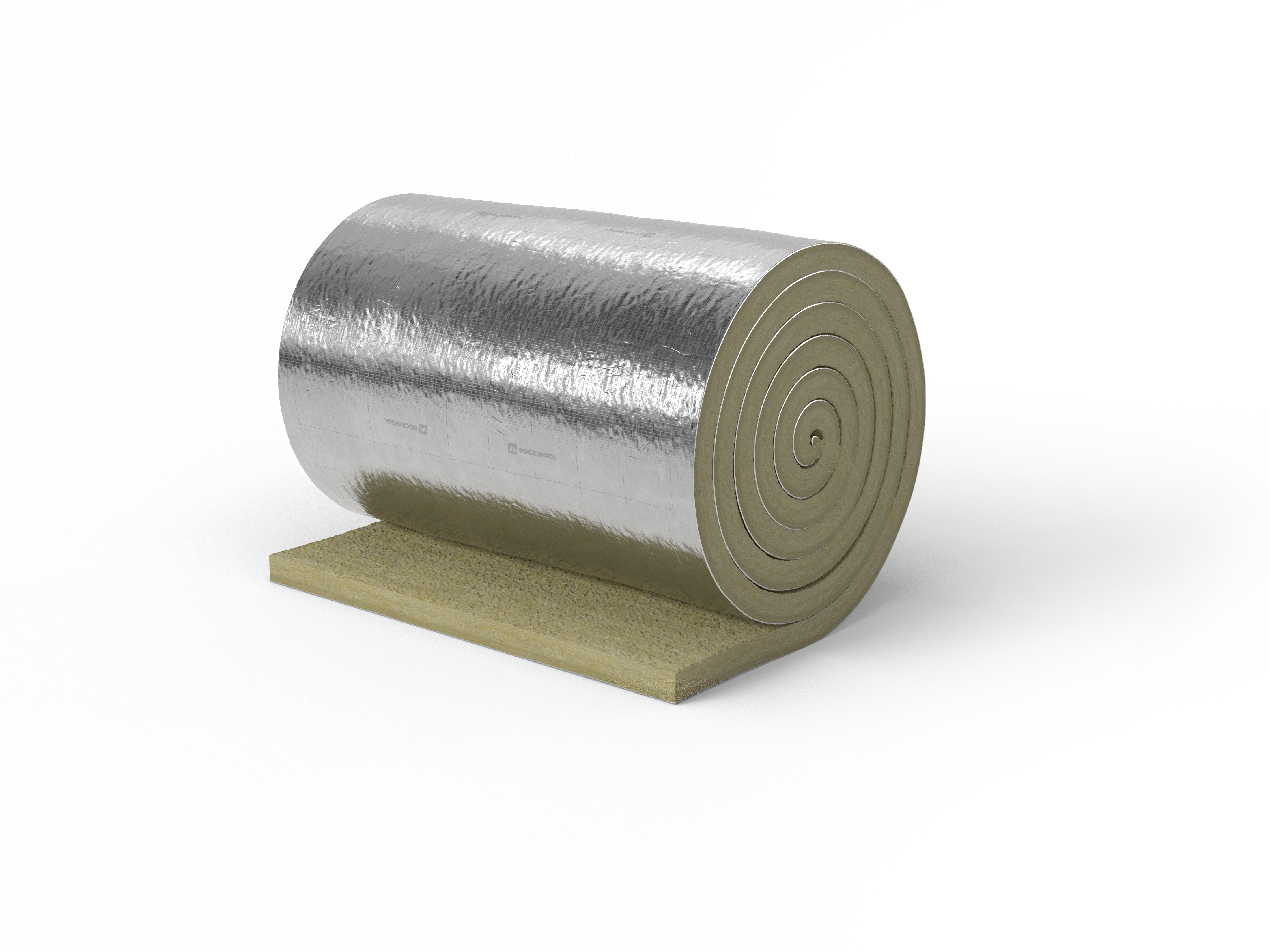 Feltro lamellare in lana di roccia, rivestito su un lato da un foglio di alluminio rinforzato da una rete in fibra minerale per l'isolamento termico e acustico di condotte di ventilazione e altre componenti impiantistiche.