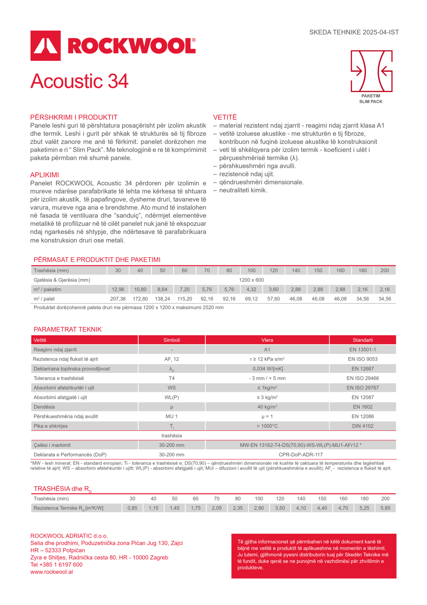 Acoustic 34 është një panel leshi guri i gjeneratës së re me dendësi të ulët, i cili ofron izolim të shkëlqyer termik, akustik dhe kundër zjarrit – perfekt për muret ndarëse dhe sistemet akustike. Ideal për kontrollin modern të zërit dhe nxehtësisë.