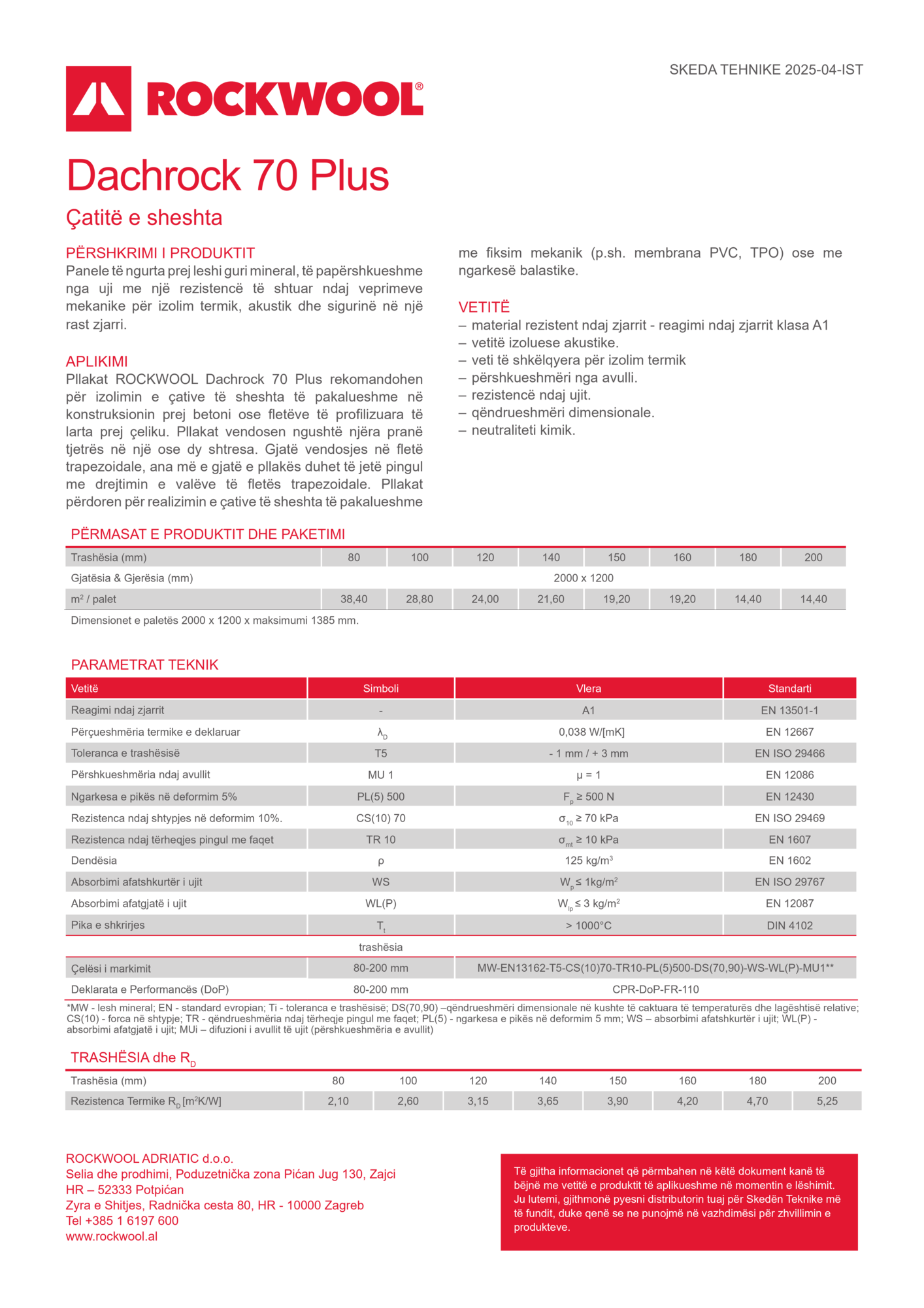 Dachrock 70 Plus është panel leshi guri me forcë të lartë i zhvilluar për izolimin e çative të sheshta ku kërkohet rezistencë dhe qëndrueshmëri superiore ndaj shtypjes. Formati i tij i hollë e bën të përshtatshëm si shtresa e sipërme në sisteme me dy shtresa, për instalime PV, rinovime çatie, ose përdorim me membrana bituminoze dhe balast. Paneli siguron performancë të qëndrueshme nën ngarkesa të rënda dhe izolim të shkëlqyer termik e akustik, duke e bërë të përshtatshëm për projekte moderne dhe efikase nga ana e energjisë.