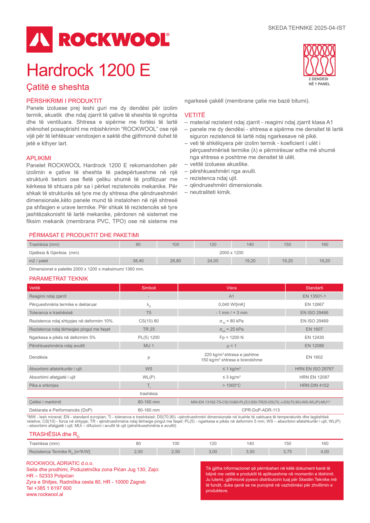 HARDROCK 1200 E është paneli më i avancuar me dy densitete leshi guri për çati të sheshta dhe solare, që ofron rezistencën më të lartë ndaj ngarkesës në pikë për ecje të sigurt dhe mbështetje të paneleve PV pa depërtim, të ekspozuara ndaj erës dhe presionit të përqendruar. Forca e jashtëzakonshme shtypëse mundëson përballimin e ngarkesave të rënda, të shpërndara si bora apo sistemet solare. Ky panel premium bashkon izolimin më të mirë ndaj zjarrit, nxehtësisë dhe zhurmës për aplikime më të kërkuara çatie dhe PV.