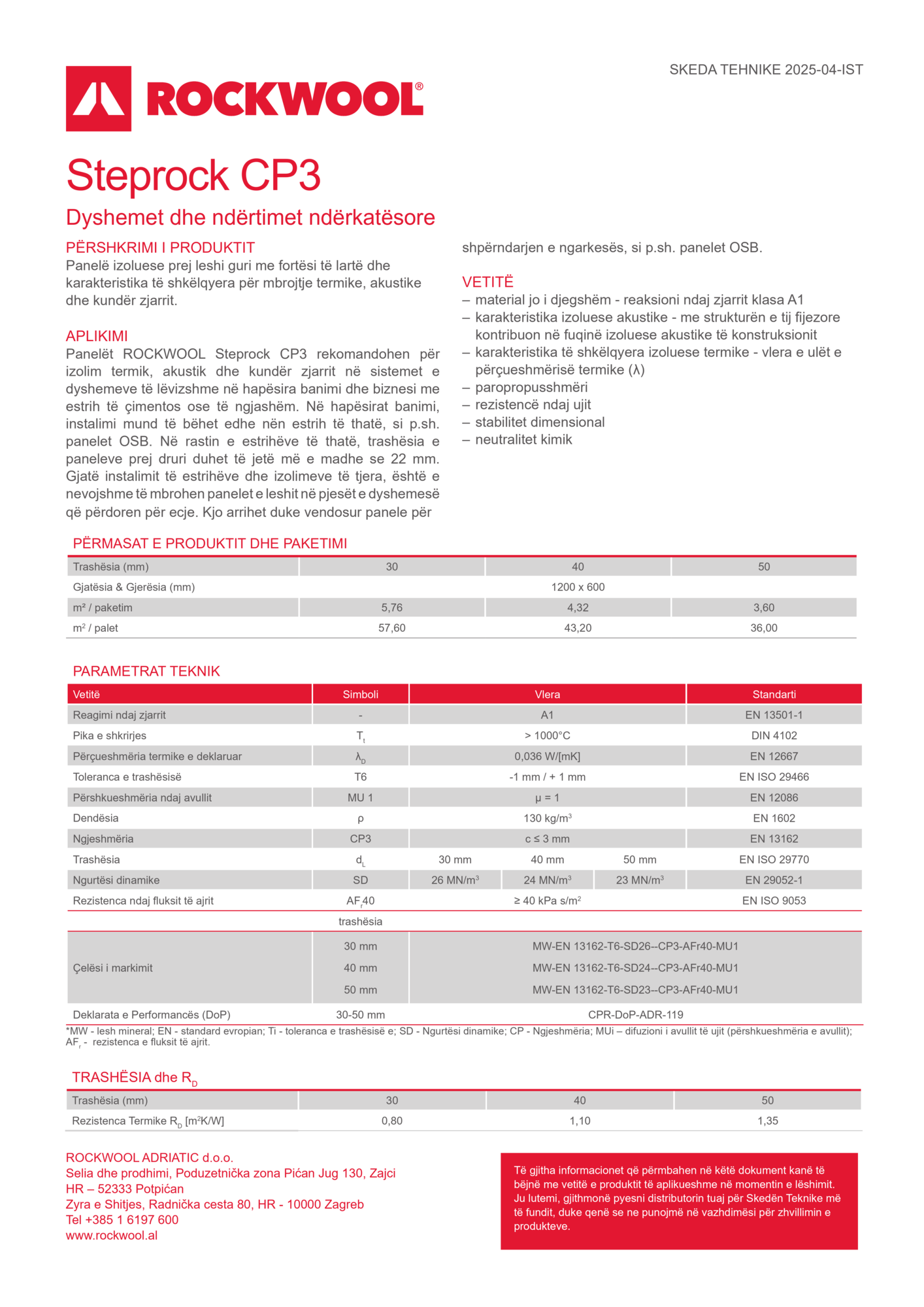 Steprock CP3 është panel leshi guri me performancë të lartë për dysheme të lëvizshme, që ofron reduktim të shkëlqyer të zhurmës nga goditjet, izolim termik dhe rezistencë ndaj zjarrit. Struktura e tij e fortë e bën ideal për ndërtesa shumëkatëshe dhe me trafik të lartë, duke siguruar ambiente më të qeta dhe komoditet më të madh. Steprock CP3 gjithashtu rrit sigurinë dhe efikasitetin energjetik, duke qenë zgjedhja kryesore për izolim akustik dhe termik të dyshemeve në aplikime të kërkuara.