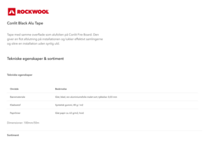 Conlit Black Alu Tape har samme overflate som Conlit Fire Board og gir en estetisk fin ytterside. Tapen lukker også effektivt skjøtene og sikrer en utførelse uten synlig steinull.