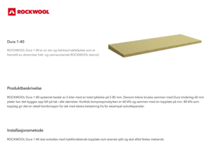 ROCKWOOL Dura 1:40 er en stiv og halvhard takfallplate som er fremstilt av ubrennbar fukt- og vannavvisende ROCKWOOL steinull.