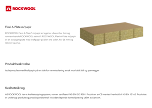 ROCKWOOL Flexi A-Plate® m/papir er laget av ubrennbar fukt-og vannavvisende ROCKWOOL steinull. ROCKWOOL Flexi A-Plate m/papir er en isolasjonsplate med kraftpapir på den ene siden. For 36 mm og 48 mm trevirke.