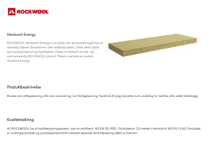 ROCKWOOL Hardrock® Energy er en plate der det øverste laget har en vesentlig høyere densitet enn den nederste delen. Dette sikrer både god isolasjonsevne og trykkfasthet. Platen er fremstilt av fukt- og vannavvisende ROCKWOOL steinull. Platens overside er merket Hardrock Energy.