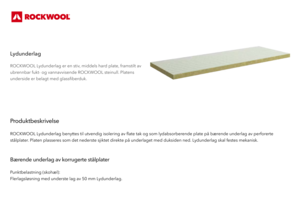 ROCKWOOL Lydunderlag er en stiv, middels hard plate, framstilt av ubrennbar fukt- og vannavvisende ROCKWOOL steinull. Platens underside er belagt med glassfiberduk.