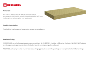 ROCKWOOL MARKPLATE® er laget av ubrennbar fukt-og vannavvisende ROCKWOOL steinull. ROCKWOOL MARKPLATE er en hardkomprimert isolasjonsplate med høy densitet.