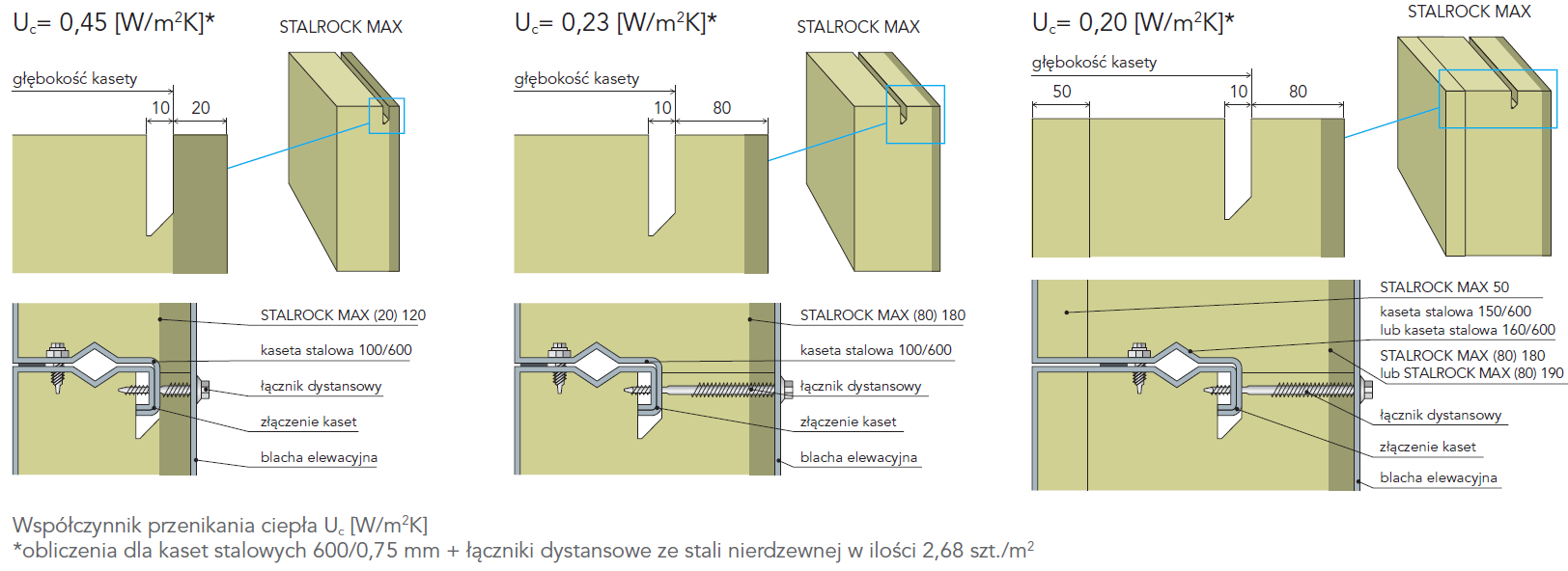 Brak mostków termicznych – jedna, dłuższa krawędź płyty STALROCK MAX posiada wyfrezowany kanał, który pozwala na montaż z przykryciem złożenia kaset - izolacja o grubości 20, 40 lub 80 mm przykrywa złącze kaset. Pozwala to zminimalizować liniowe mostki: termiczny, ogniowy, akustyczny. Tak wbudowana izolacja w znaczący sposób zwiększa efektywność termoizolacji bez ponoszenia dodatkowych kosztów.