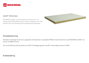 ROCKWOOL CONLIT 120 är tillverkad av obrännbar, fukt- och vattenavvisande ROCKWOOL stenull. Det är en väldigt styv och hård produkt med utomordentligt goda brandskyddande egenskaper.