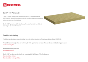 Conlit 150 P är tillverkad av obrännbar, fukt- och vattenavvisande ROCKWOOL Stenull. Produkten används som brandskydd av bärande stålkonstruktioner eller bjälklag. Conlit 150P går att beställa i tjockare utförande. Kontakta kundtjänst eller säljare för mer information.