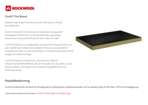 Conlits brandtekniska egenskaper, dimensioner och tjocklekar försämras inte under produktens livslängd. Conlit Fire Board är en högkvalitativ produkt med många fördelar som gör installationen enklare och snabbare. Brandskivorna anpassas enkelt efter ventilationskanalens form, och den svarta aluminiumtejpen bidrar till snyggare fogar och en mer estetisk finish. Conlit Fire Board är tillverkad av icke-brännbar, fukt- och vattenavvisande ROCKWOOL stenull. Framsidan har en beläggning av svart förstärkt aluminiumfolie. Lösningen bidrar också till energieffektivitet och bullerreducering tack vare stenullens egenskaper.