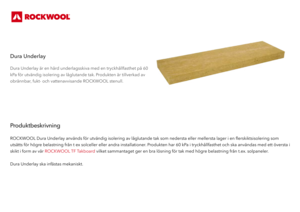 Dura Underlay är en hård underlagsskiva med en tryckhållfasthet på 60 kPa för utvändig isolering av låglutande tak. Produkten är tillverkad av obrännbar, fukt- och vattenavvisande ROCKWOOL stenull.