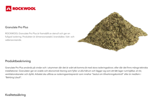 ROCKWOOL Granulate Pro Plus är framställt av stenull och ger en fullgod isolering. Produkten är dimensionsstabil, brandsäker, fukt- och vattenavvisande.