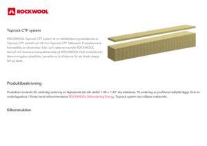 ROCKWOOL Toprock CTF system är en takfallslösning bestående av Toprock CTF Lamell och 30 mm Toprock CTF Takboard. Produkterna är framställda av obrännbar, fukt- och vattenavvisande ROCKWOOL stenull och levereras sampaketerade på ROCKWOOL Feet emballerad i återvinningsbar plastfolie. Lamellerna är tillskurna för att direkt skapa fall på taket.