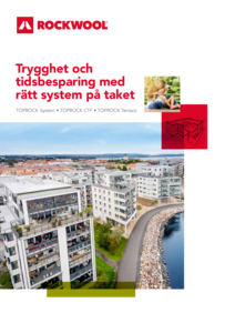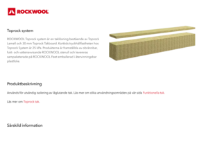 ROCKWOOL Toprock system är en taklösning bestående av Toprock Lamell och 30 mm Toprock Takboard. Korttids tryckhållfastheten hos Toprock System är 25 kPa. Produkterna är framställda av obrännbar, fukt- och vattenavvisande ROCKWOOL stenull och levereras sampaketerade på ROCKWOOL Feet emballerad i återvinningsbar plastfolie.