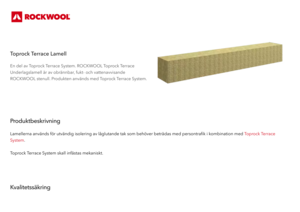 En del av Toprock Terrace System. ROCKWOOL Toprock Terrace Underlagslamell är av obrännbar, fukt- och vattenavvisande ROCKWOOL stenull. Produkten används med Toprock Terrace System.