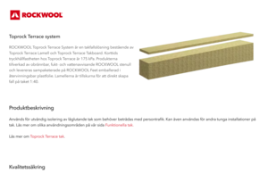 ROCKWOOL Toprock Terrace System är en takfallslösning bestående av Toprock Terrace Lamell och Toprock Terrace Takboard. Korttids tryckhållfastheten hos Toprock Terrace är 175 kPa. Produkterna tillverkad av obrännbar, fukt- och vattenavvisande ROCKWOOL stenull och levereras sampaketerade på ROCKWOOL Feet emballerad i återvinningsbar plastfolie. Lamellerna är tillskurna för att direkt skapa fall på taket 1:40.