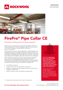 FirePro Pipe Collar CE is available in depths of 30mm or 40mm allowing it to be installed around a service where space is restricted. FirePro Pipe Collar CE can be installed on flexible and rigid walls and rigid floor constructions.
