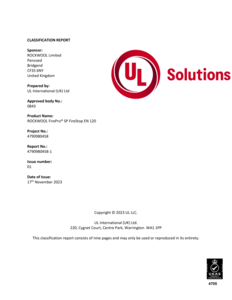 SP FireStop EN -curtain wall UL 4790980458 - Classification Report. This classification report defines the classification assigned to the element, ROCKWOOL FirePro® SP FireStop EN 120, in accordance with the procedures given in EN 13501-2:2016.